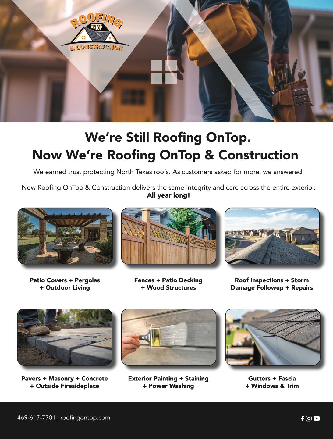 Our mission is to build trust and security with every homeowner, business owner, and our community — in every Texas season. We’re committed to delivering OnTop professionalism, honesty, integrity, and excellence across all our exterior services. From roofing to repairs, patios to paint, we treat every property like our own, ensuring quality that lasts and service you can count on.
